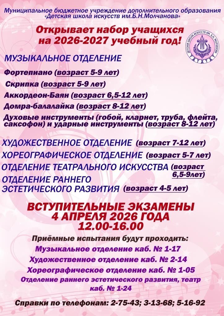 4 апреля в Детской школе искусств им. Б.Н. Молчанова состоятся вступительные испытания.