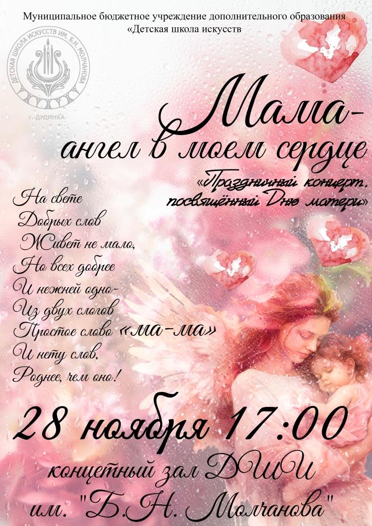 28 ноября в Детской школе искусств им. Б.Н. Молчанова состоится праздничный концерт, посвященный Дню матери «Мама – ангел в моем сердце».