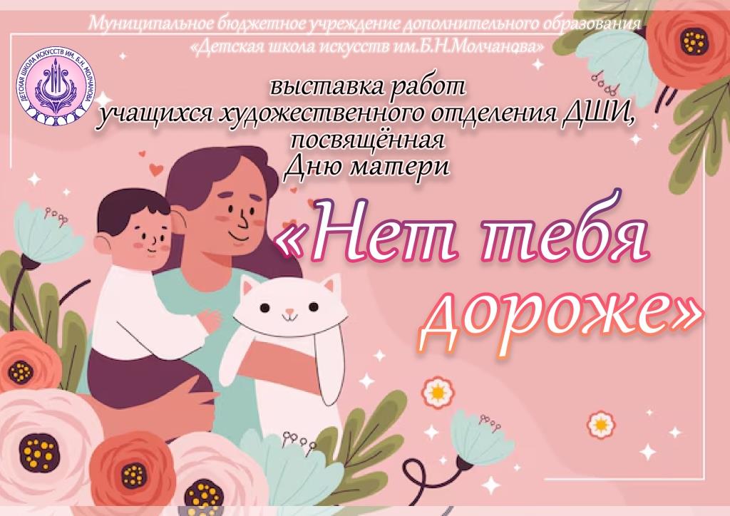 В преддверье празднования Дня матери в фойе Детской школы искусств им. Б.Н. Молчанова открылась выставка работ учащихся художественного отделения «Нет тебя дороже», посвященная этой дате.