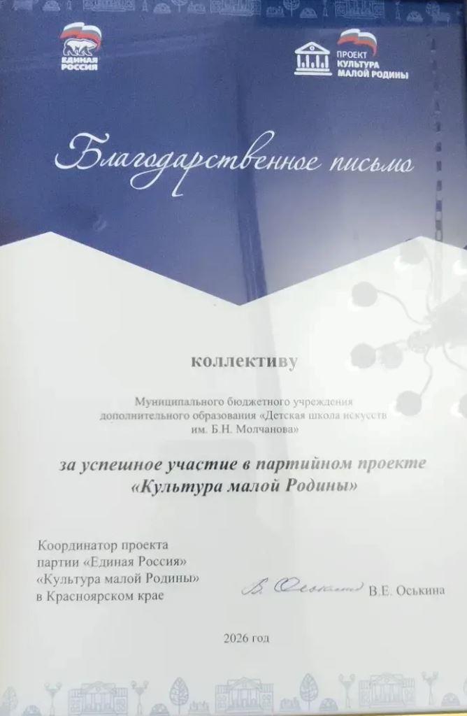 На заседании Общественного совета федерального партийного проекта «Культура малой Родины» в Красноярском крае председатель комитета Законодательного собрания Красноярского края по образованию и культуре, координатор проекта партии «Единая Россия», «Культура малой Родины в Красноярском крае» Вера Егоровна Оськина, вручила благодарственное письмо коллективу Детской школе искусств им. Б.Н. Молчанова «за успешное участие в партийном проекте «Культура малой Родины».