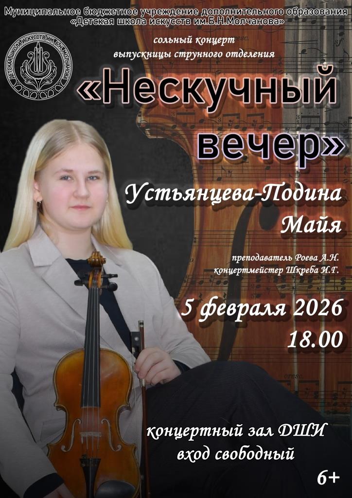 5 февраля в Детской школе искусств им. Б.Н. Молчанова состоится отчетный концерт выпускницы струнного отделения Майи Устьянцевой-Подиной «Нескучный вечер».