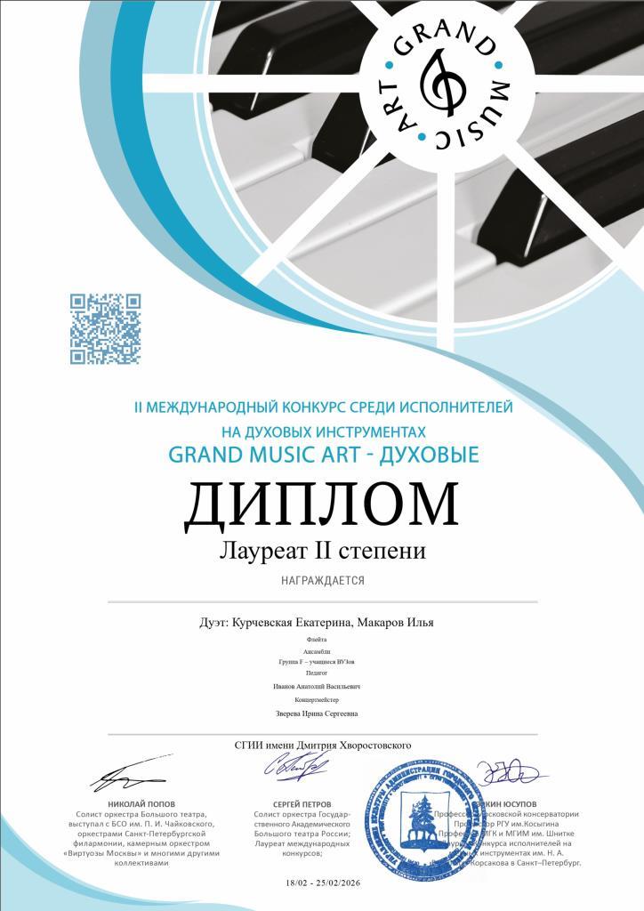 Преподаватель Детской школы искусств им. Б.Н. Молчанова по классу флейты Илья Александрович Макаров стал лауреатом II степени Международного конкурса среди исполнителей на духовых инструментах «GRAND MUSIC ART» в составе дуэта.