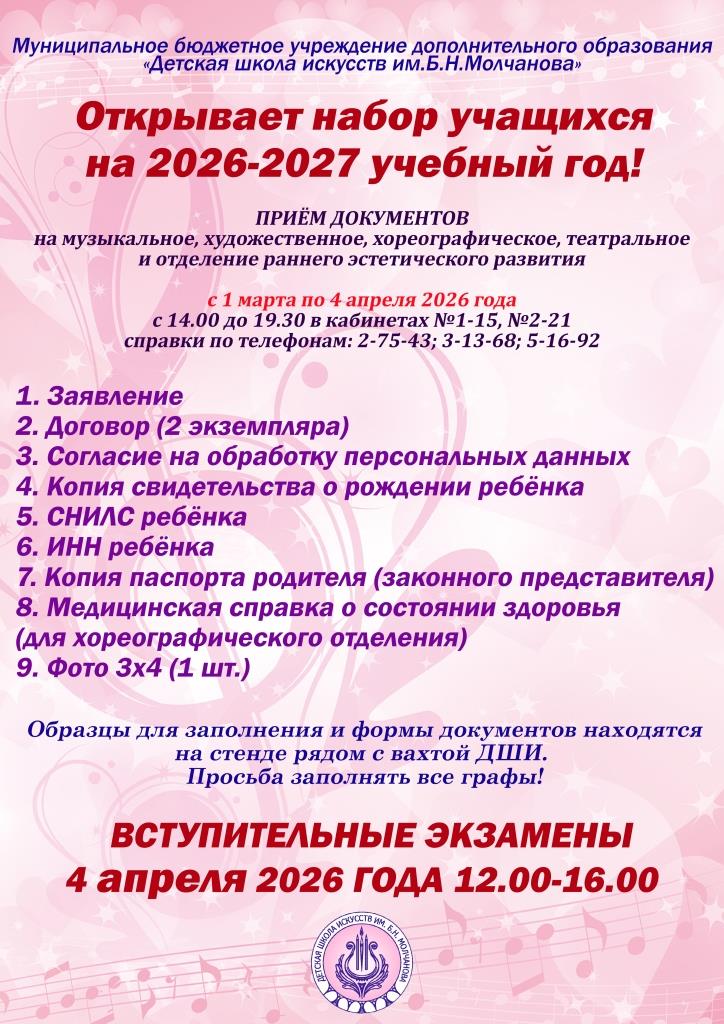 4 апреля в Детской школе искусств им. Б.Н. Молчанова состоятся вступительные испытания.