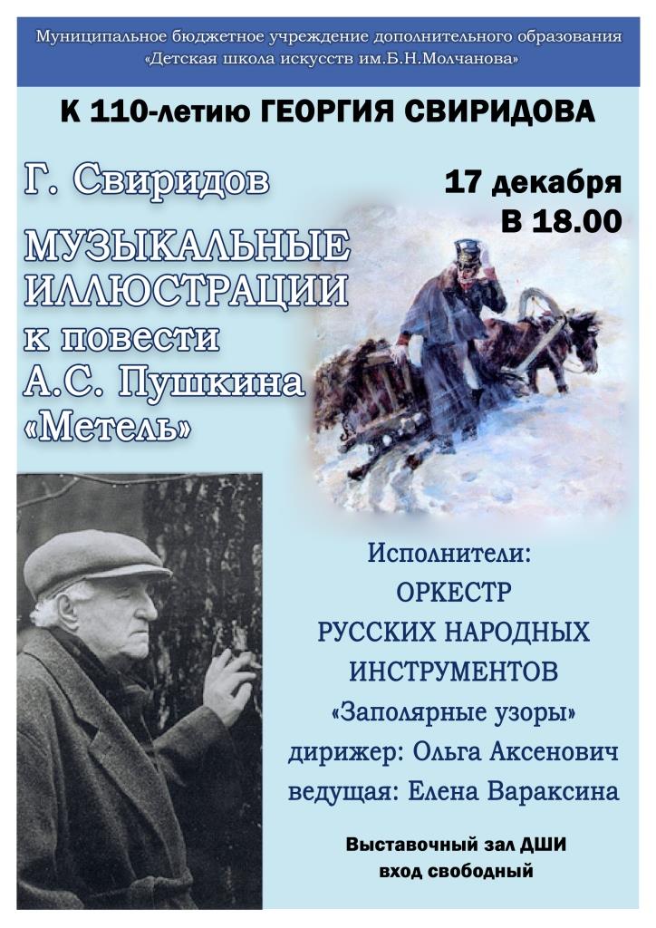 Рассказ будет сопровождаться музыкальными иллюстрациями к повести Георгия Васильевича Свиридова в исполнении оркестра русских народных инструментов «Заполярные узоры» под руководством Ольги Валерьевны Аксенович.