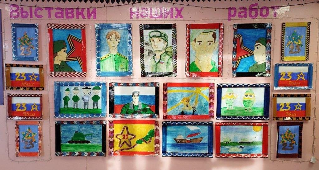 Под руководством преподавателя Валентины Алексеевны Чунанчар  ребята изобразили бойцов разных видов войск, военную технику. Также экспозицию украсили праздничные открытки, созданные юными художниками.