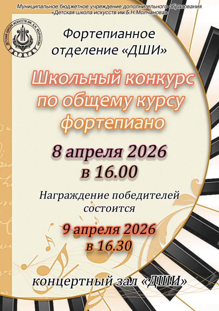 8 апреля в Детской школе искусств им. Б.Н. Молчанова пройдет школьный конкурс юных исполнителей по общему курсу «Фортепиано».