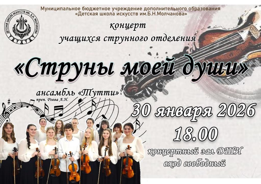 30 января в Детской школе искусств им. Б.Н. Молчанова состоится отчетный концерт ансамбля скрипачей «Тутти» «Струны моей души».